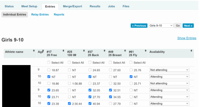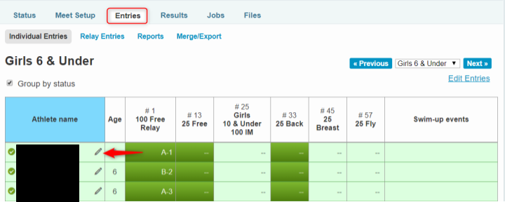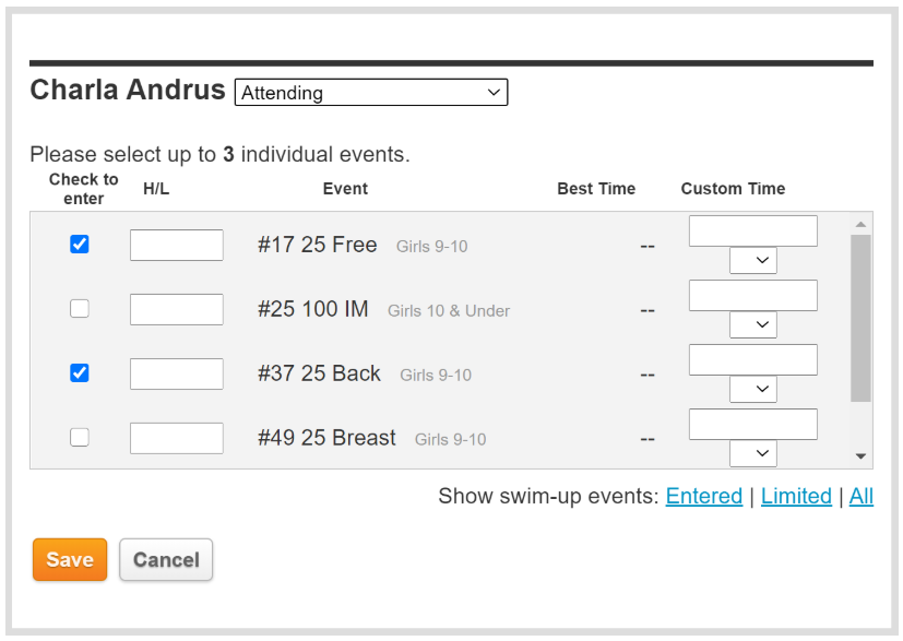 Swimmer entries can be completed by clicking the pencil icon next to each swimmer’s name and checking the box for each event.