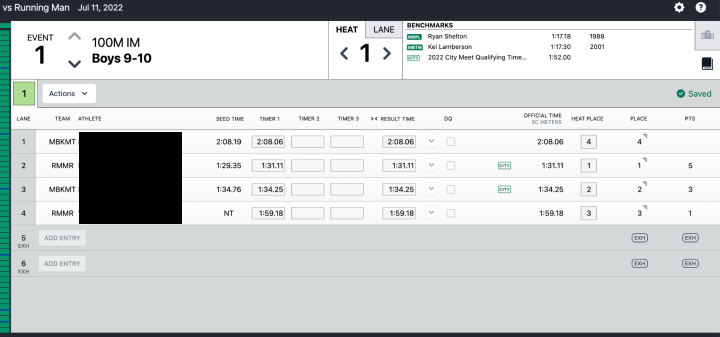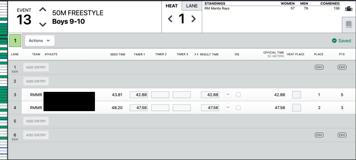- Match the lane slip to the entry in Meet Maestro (swimmer’s name, team, heat, and lane should all match)