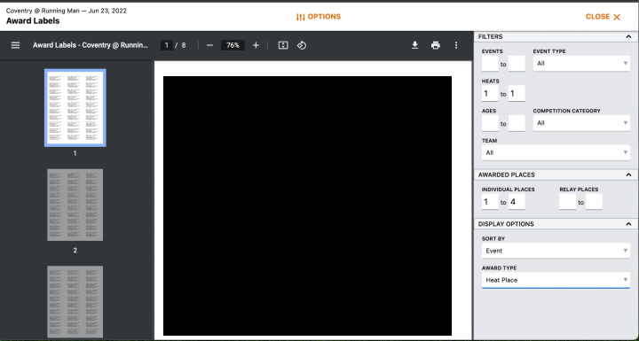 This will generate Award Labels for Heat 1 placement only. Once the report is generated, click the Printer icon to send to the Printer.