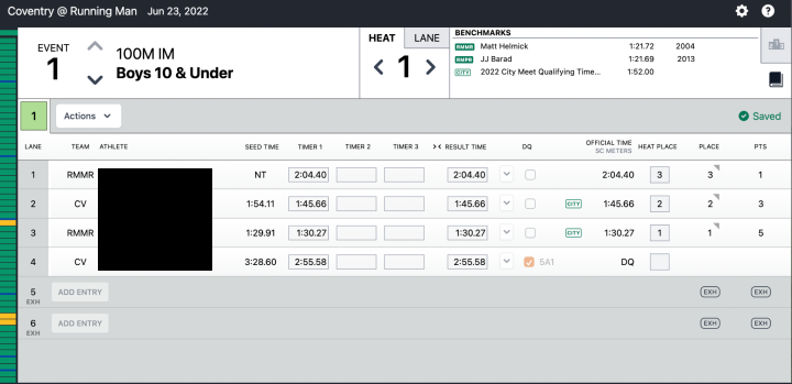 - Once all entries have been completed, review the collection of events with the Meet Ref who will sign off on the meet