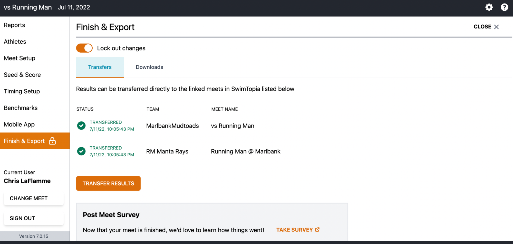 This screen will allow you to transfer meet results to each team by clicking on the Transfer Results button