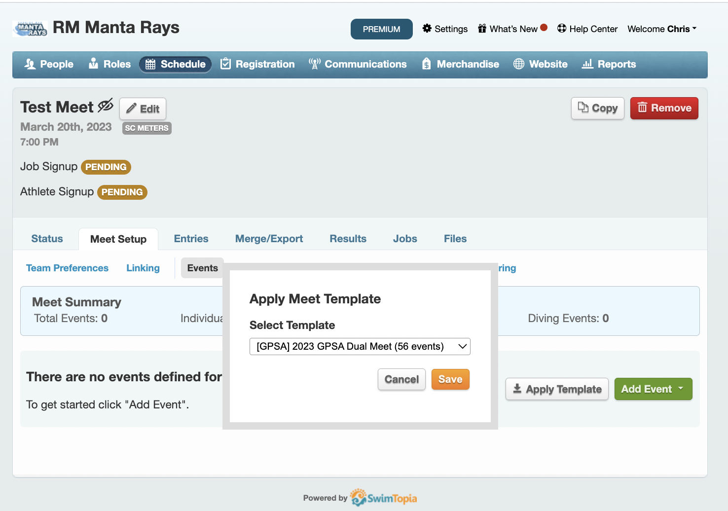 - Apply Meet Template. Under Meet Setup → Entries, Click Apply Template. Select [GPSA] 2024 GPSA Dual Meet (56 Events).