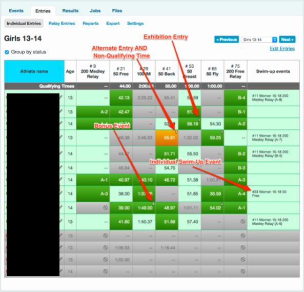 The Entries Matrix uses the below indicators and colors to indicate the status of a swimmer.