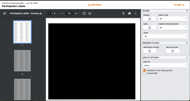 Next, click on the CLOSE link on the top right to return to Reports. Click on Participation Labels. Select Exhibition / Non-Placing Only. This will generate all the Exhibition labels. Once the report is generated, click the Printer icon to send to the Printer.